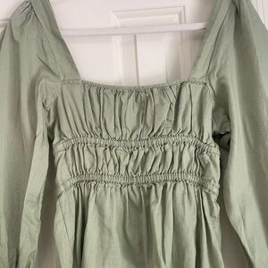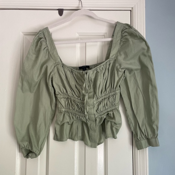 This J. Crew blouse in a vibrant green hue features charming puff sleeves and a smocked bodice for a flattering fit. The ruffled details add a touch of elegance, making it a versatile piece for any occasion.