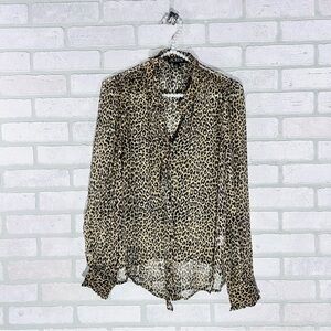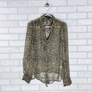 Stylish leopard print blouse. Button-up front. Long sleeves for versatile wear.