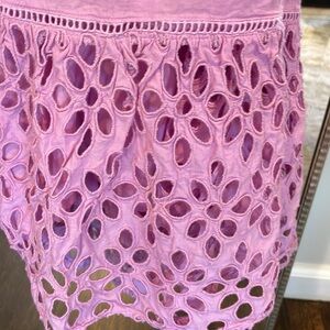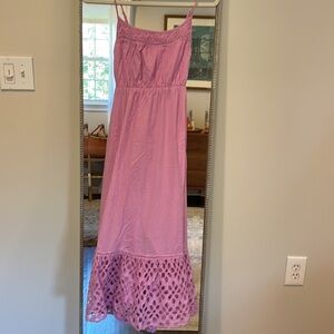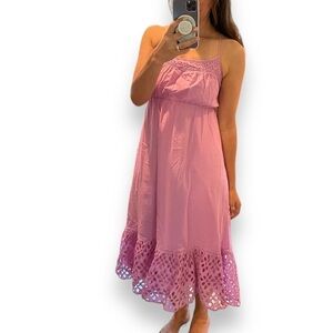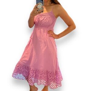 J Crew Rose Pink Eyelet MIDI Dress. Empire type bodice with shirred elastic at back and adjustable straps. Size XS. Very good condition.
