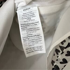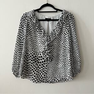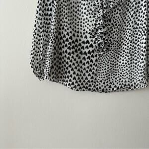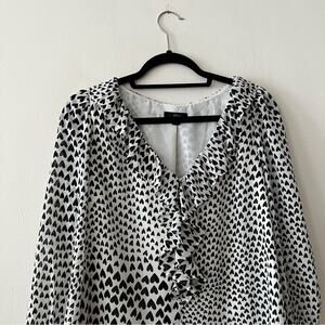 In good preowned condition. All-over white and black heart print with ruffle details around the neckline.