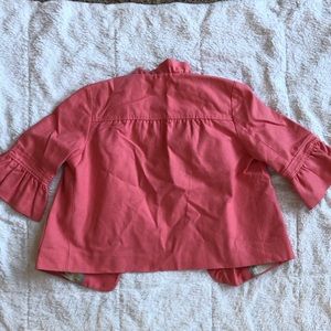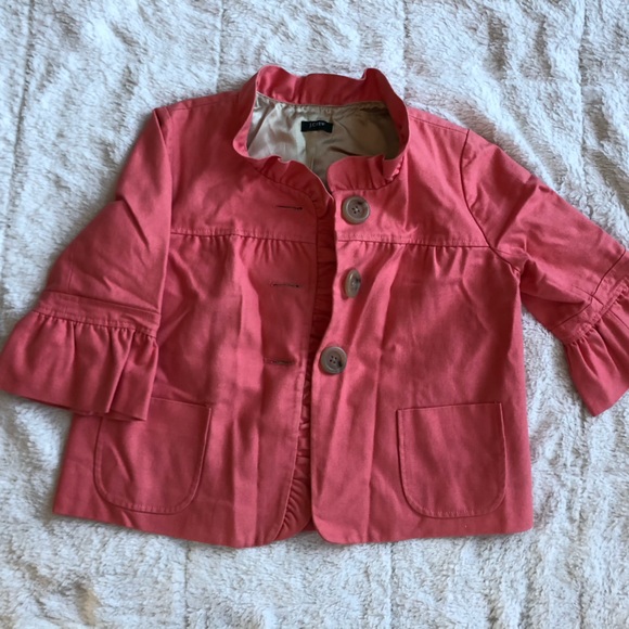 J. Crew Ruffle Jacket in Coral. With 3/4 sleeves in a beautiful twill, this is perfect for Spring. Excellent condition. Tag was removed, but this fits a size Small.