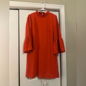 Bright red/orange dress with stylish bell sleeves. Perfect for a bold, elegant look.