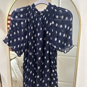 Elegant and chic navy blouse with white polkadots. Features ruffled details. Fits more like a medium. No flaws. Worn in the office or for fun!
