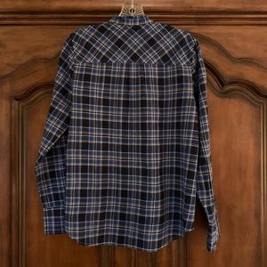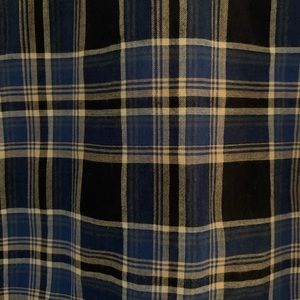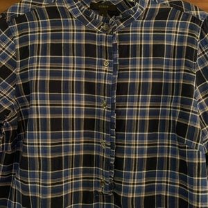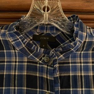 Never worn! J Crew ruffle popover shirt in ocean plaid. Color is blue navy. Pretty small ruffles around collar and down front button placket. Buttons at wrists. 99% cotton and 1% elastane. Size 6.