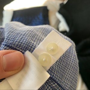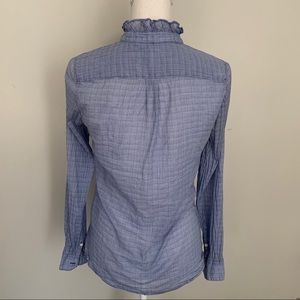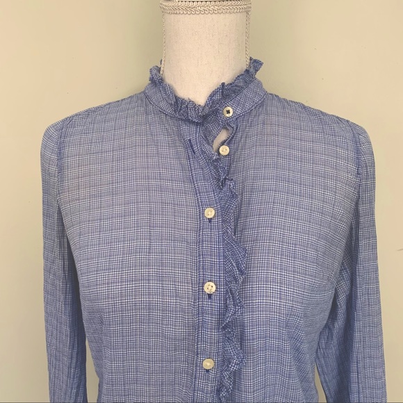 Pretty button down shirt with small ruffle neckline. Very thin material. Great condition. Layer this with the white French Connection sweater in my closet for a sophisticated look!