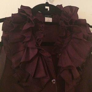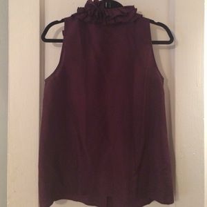 Maroon ruffle sleeveless blouse perfect for the office or preppy look with jeans. Great with a cardigan for the fall.