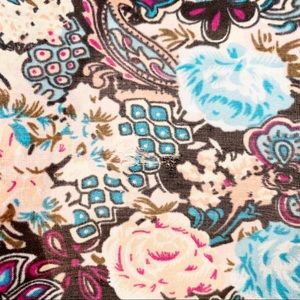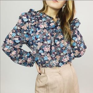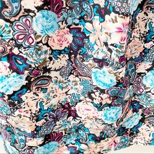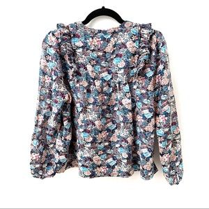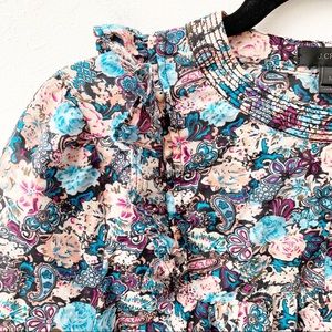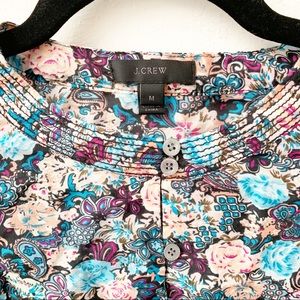 J. Crew cotton silk blend ruffle top with floral design. Size M. Lightweight, a bit sheer. Small hole in front middle, hardly noticeable with the complex pattern (I almost missed it!). Approx 20” pit to pit with extra room, 23” shoulder to bottom hem.