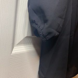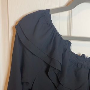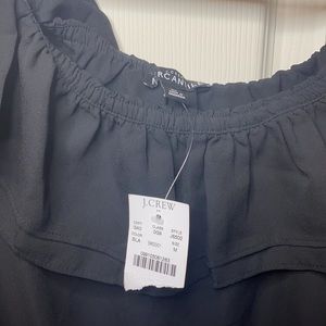 J Crew black ruffled top. 3/4 sleeves with elastic band at end. Can be worn off shoulder. 100% polyester but has a silky/sheer feel to it. Not considered a crop but does run a littler short. Never worn.