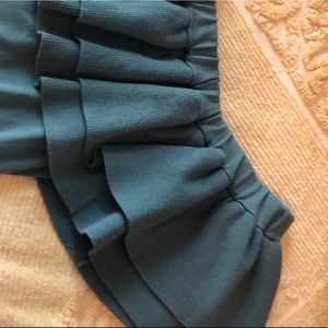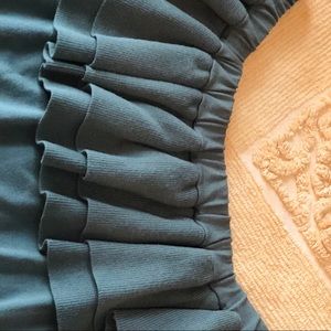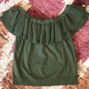 This off-the-shoulder ruffle top is perfect for casual or festive events. The fabric is 72%Viscose and 28%Polyester. Never worn, not once! Still has original tags attached. It feels/looks like quality thick knit. The condition is as good as new. The comfort of this top is amazing. The color is a deep forest green/army green tone.