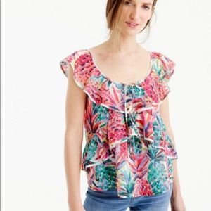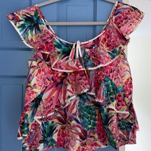 Fun and summery ruffle top from J. Crew. Can be worn on and off shoulders. Print is Ratti Painted Pineapple. Size 0