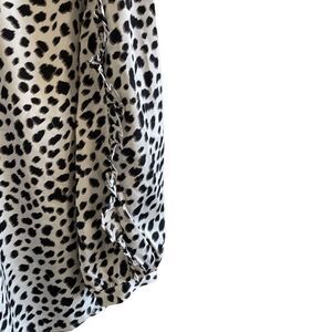 “Our new favorite way to ruffle up: this perfectly draped top with ruffles down the sleeve and around the neck. We extra-love how the leopard-printed satin-y fabrication adds polish to whatever you pair it with (yup, even sweatpants).” Button closure keyhole in back and one button closure sleeve cuffs.