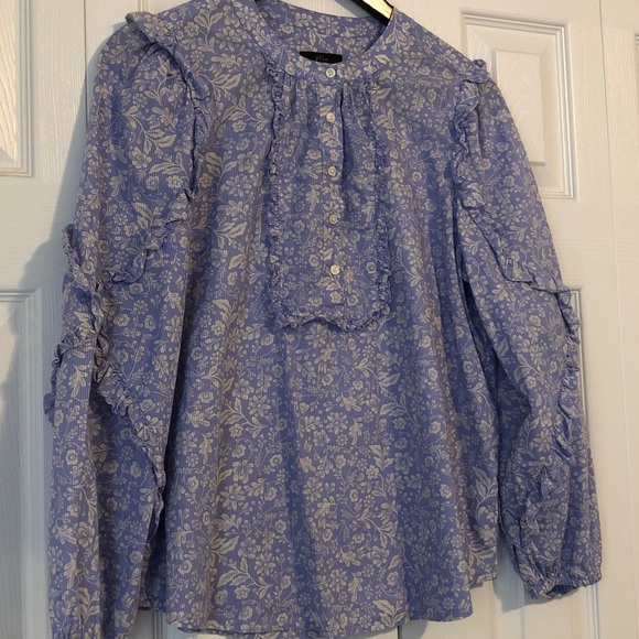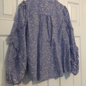 Beautiful romantic floral top with ruffles and button detail. Soft blue and white design.