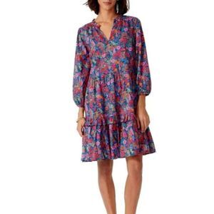 The vibrant Liberty London floral print showcases rich hues of blue, pink, orange, and green, making this dress a standout piece for spring, summer, and even early fall. Thoughtful design details like elasticized cuffs, button-front placket, and side seam pockets make it both functional and stylish.