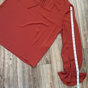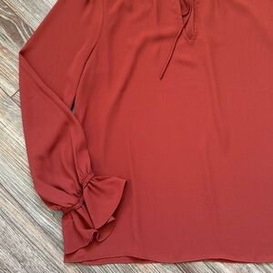 Chic rust blouse with ruffled neckline and cuffs. Ideal for versatile styling.