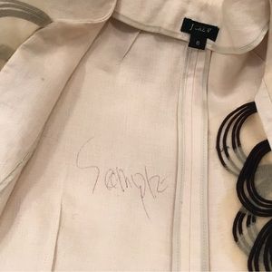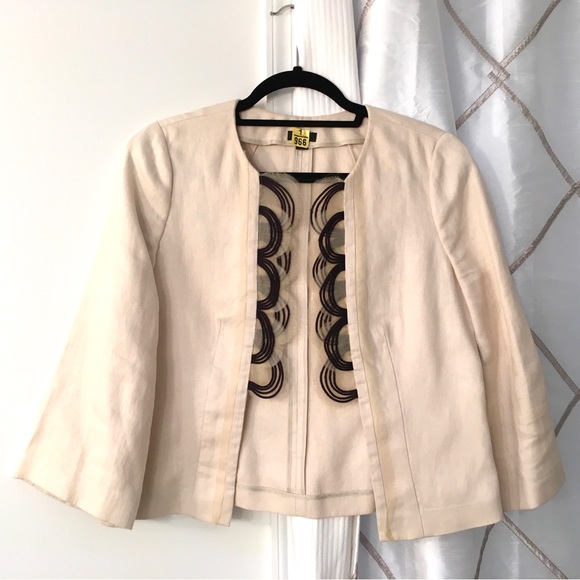 Gorgeous jacket from the NYC Sample Sale. Linen fabric. Dry clean only. Front trim is one-of-a-kind. Perfect fancy topper for black or cream pants, skirts, or dresses. Excellent condition. Measurements shown in pics. Sleeves are 18 1/2” long along the top of the sleeve from the shoulder seam down.