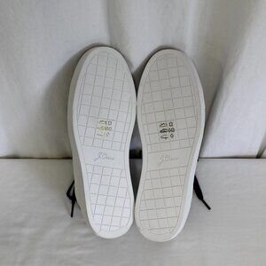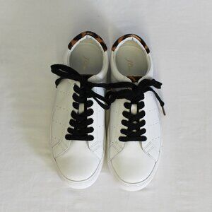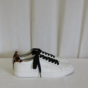 Introducing our first-ever sneaker (we took time to get these just right, and at a just-right price). These have a classic white leather upper and a supercushy supportive insole, plus a few details that make them totally unique—like this so-us leopard print tab at the heel.