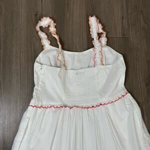 The J Crew Scalloped Trim Sleeveless Flowy Midi Dress in white, red, and orange offers a vintage-inspired, effortless silhouette perfect for casual, laid-back styling. Designed with scalloped trim details and a flowy, relaxed fit, this bohemian-chic midi dress embodies free-spirited elegance with a modern twist. The vibrant color combination adds a bold statement to your wardrobe, while the sleek, sleeveless design ensures a cool, comfortable feel all day long. Whether paired with sandals for a casual daytime look or dressed up with heels for an evening out, this fashion-forward dress is perfect for creating a versatile, on-trend outfit that exudes effortless charm and distinctive style.