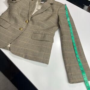 Good preowned condition with light signs of wear some staining under armpit on lining on one side and small discoloration on arm. Please see all photos. Blazer has been steamed, but not dry cleaned