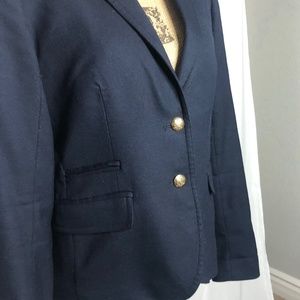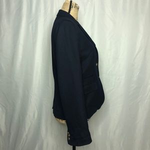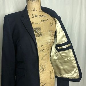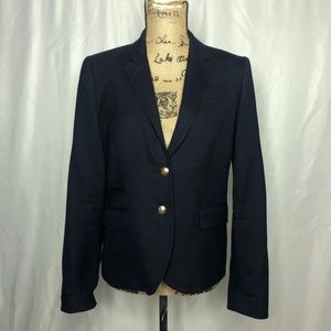 J Crew Schoolboy Blazer jacket. Wool blend, 2% spandex. Lined. Navy Blue color. Gold logo buttons. 2 button jacket. Women's size 6. 18.5 inch pit to pit. 24 inch length. 17 inch waist across. 17.5 inch pit to cuff.