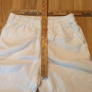 These J Crew Seaside Linen Blend Pants in white are perfect for a beach jogger style with an elastic waist for comfort and ease of movement. Made with a linen and lyocell blend, they are lightweight, breathable, and easy to care for with machine washable instructions. The mid-rise fit and tapered leg give them a trendy and versatile look suitable for casual and travel occasions in all seasons. With a waist size of 27 inches and a size 4, these pants are a stylish addition to any wardrobe, ideal for those who appreciate a blend of comfort and fashion.