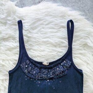 J Crew navy blue tank top with sequin ruffles on chest. Size small. Good used condition.