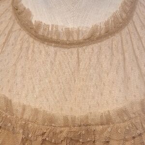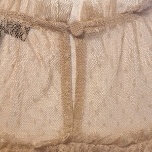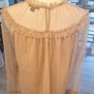 Chic sheer blouse with delicate ruffles. Features a dotted pattern lace netting. Perfect for stylish outings. Size M. In New condition.