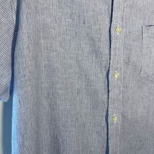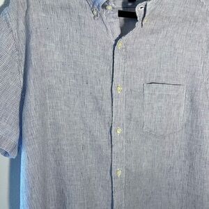 Look stylish and preppy with this J. Crew men's shirt in size XL. The blue striped linen shirt features a button-down collar and short sleeves, making it perfect for summer, fall, or spring. The slim fit design is flattering for all body types, and the shirt is machine washable for easy care.
