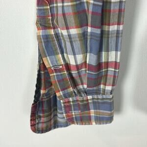Gently Used Tailored By J. Crew Button Down Shirt. This is a men's medium. Modern plaid pattern throughout with red, blue, green, and gold. Lightweight and comfortable shirt. 100% cotton.