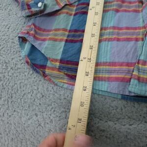 J Crew Shirt Mens Medium Button Up Indian Madras Plaid Blue Classic Cotton. Good preowned condition. Small tear (no hole) in top shoulder. See pics for measurements and details.