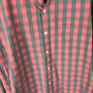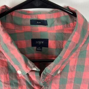 Gently Used J. Crew Factory Button Down Shirt. This is a men's XL. Coral and green modern plaid / gingham pattern throughout. Single front pocket. Slim fit. 100% cotton. Good looking shirt!