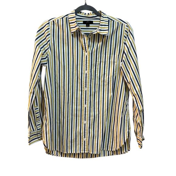 J Crew Shirt Womens 6 White Yellow Navy Stripe Button Front Long Sleeve Cotton