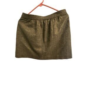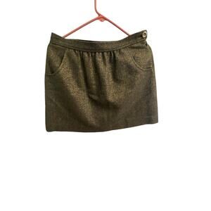 Add some sparkle to your wardrobe with this black J.Crew mini skirt. The skirt features gold thread accents and a button closure, adding a touch of elegance to your outfit. The wool and nylon blend material keeps you warm during the colder seasons, while the short length makes it perfect for any party or casual occasion. This skirt also includes pockets for added convenience. Available in size 2, this skirt is a must-have for any fashion-forward woman.