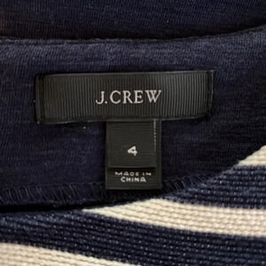 J. Crew Short Sleeve Striped Panel Exposed Back Zipper Dress in Navy - Size 4. Great pre-owned condition. Minor signs of wear. Short sleeves, rounded neckline, exposed back zipper closure, striped panel inset in front, navy blue with white stripes, stretch. Approximate measurements: 17" bust, 33" length.