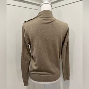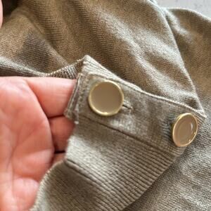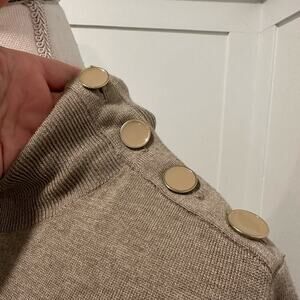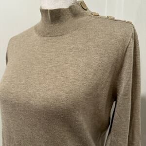 Elevated style with a lighter weight. Perfect option when you need a dressier sweater. Gold/tan button detail at one shoulder. Buttons are functional. Fabric is 55/20/19/3/3 lyocell/acrylic/poly/elastane/silk blend. No obvious flaws or signs of wear.
