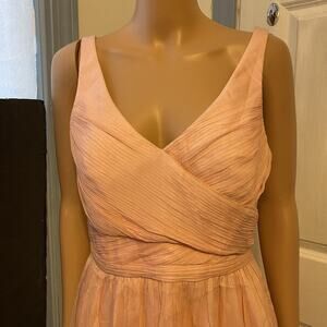 This beautiful J.Crew dress is perfect for any occasion. Made of luxurious silk chiffon, it features a flattering V-neckline and a strappy sleeve design. The dress is baby pink in color and has a fit and flare style that creates a empire waist and a short dress length, making it a perfect choice for a prom, wedding or any formal event.