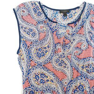 J. Crew 100% silk smocked waist sleeveless dress in paisley print with blue, pink, yellow, black, & white. Blue piping trim around the neck and arm openings. Lower skirt is lined. Cute, lightweight and breezy, with a boho vibe, perfect for spring, summer, and vacations.
