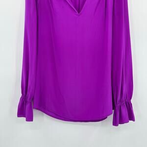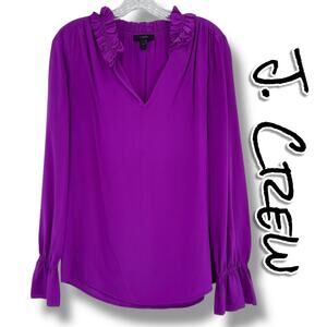 J Crew womens blouse in rich purple. 100% silk. V neck with ruffle detail. Long sleeve with ruffle cuffs. Lightweight. Size 2T. Excellent used condition. No flaws detected. See measurements for proper fit.