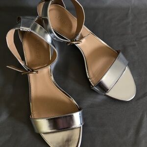 J. Crew silver, open-toed, 2 inch heeled sandals. Gold buckle that clasps around ankle and one thick silver strap on toe.