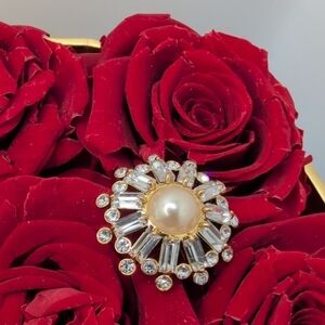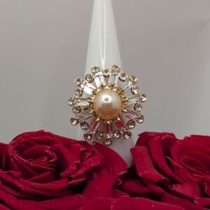 This elegant J. Crew ring showcases a central cream pearl encircled by a halo of clear stones, all set in a sleek Goldtone band, creating a dazzling and sophisticated look. New without tag condition.