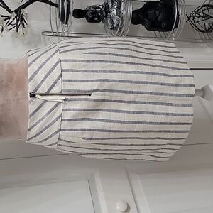 J Crew Size 0, 100% Linen Crossover / Wrap, Asymmetrical Blue Striped Skirt, EUC. No Holes, Rips, Stains or Snags. Adorable Ivory Skirt with Blue Patterned Stripes. Wide Waistband, Exposed Back Zipper, Lined. Please refer to measurements in photos to ensure proper fit.