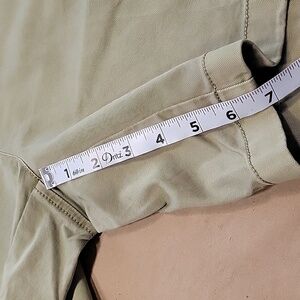 J. Crew Size 00 Olive Sand Green 7-Inch Broken-in Flex Chino Shorts. Excellent Used Condition. Factory Fading and Distressing - give that "Broken In" Look. 7 Inch Inseam. Front and Back Pockets. Zipper Fly with both Button and Hook & Bar Closure. Please refer to measurements in photos to ensure proper fit.