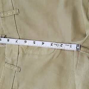 J. Crew Size 00 Olive Sand Green 7-Inch Broken-in Flex Chino Shorts. Excellent Used Condition. Factory Fading and Distressing - give that "Broken In" Look. 7 Inch Inseam. Front and Back Pockets. Zipper Fly with both Button and Hook & Bar Closure. Please refer to measurements in photos to ensure proper fit.