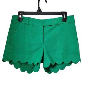 J. Crew Size 2 Shamrock Green Scalloped Trim Linen Blend Shorts, NEW with Tag. Front Slant Pockets, Rear Welt Pockets. Front Zipper with Button and Hook & Bar Closure. 4" Inseam. Please refer to measurements in photos to ensure proper fit.