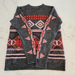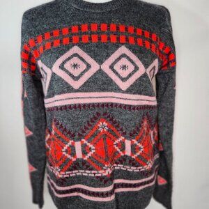 J. Crew Size Medium Abstract Fair Isle Gray Red Pink Wool Mohair Blend Sweater