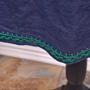 Sleeveless cotton/linen blend dress is lightweight and will help you keep cool. In a navy blue with green embroidery around the neckline and hem. Keyhole back with button closure. Fully lined. POCKETS!