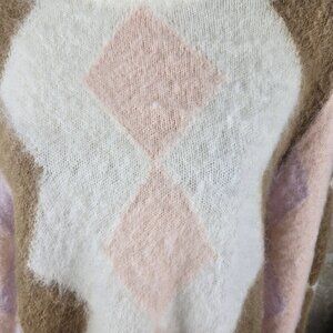 This cozy sweater is perfect for cooler temperatures. It has a mixture of vertical chevron stripes and argyle diamonds in pink, brown, and lilac on a cream background. Crew neck. The long sleeves have a slight puffed shoulder detail. A great way to stay warm and stylish at the same time.