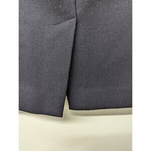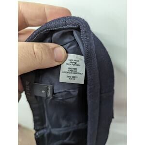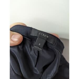 This is a J.CREW women's pencil skirt in navy blue, made of 100% wool. It features patch pockets, a zipper closure, and a knee-length straight style with a slit at the back. The skirt is lined and designed for winter and fall wear. It is a size 8 and recommended for workwear or business occasions, with a dry clean only care requirement.