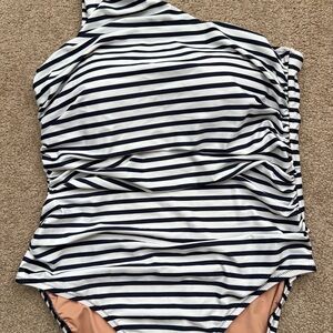 J Crew Sleek Ruched One Shoulder Dark Evening Stripe(white and navy blue) One Piece Swimsuit Size 14. No Flaws. Like New Condition!