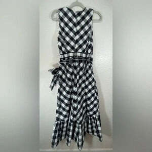 J. Crew Sleeveless Faux-Wrap Midi Dress in Gingham Cotton Poplin Women’s Size 6. “We crafted this super flattering dress silhouette-featuring a faux-wrap top and bow belt-in an oversized gingham print with a party-perfect ruffled hem. It's fully lined too, so the only thing you'll have to worry about is what kind of dip to bring.