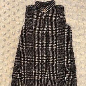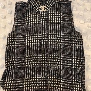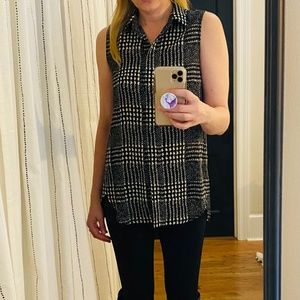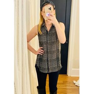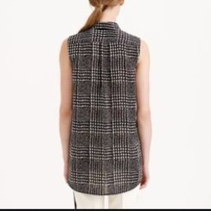 J. Crew sleeveless blouse in a bold black and white plaid pattern. Sleeveless collared button-down blouse with rounded hi-low bottom hem (higher hem at front & lower hem at rear). The plaid pattern is a slightly blurred black & white print is similar to a modern take on houndstooth. Lightweight, loose-fitting, and flowy; great for layering or wear alone! Polyester, style # B1147. Lightly worn, in VERY GOOD condition.